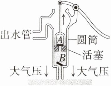 3. 抽水机也叫水泵,如图是活塞式抽水机工作原理的示意图。其中,活塞跟筒壁紧密接触但是可以上下滑动,A、B是只能向上开启的阀门,这样,活塞不停地上下移动,水就从管口连续不断地流出,下列说法正确的是