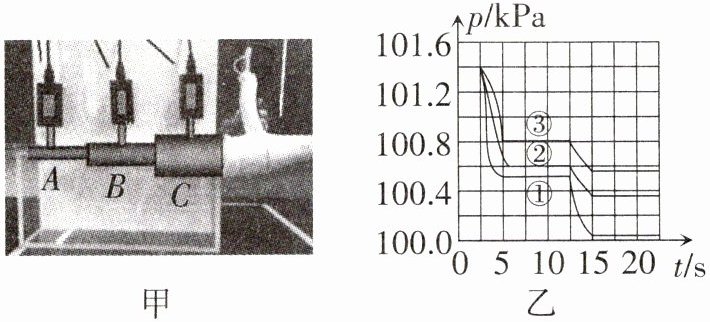 (2)将三个气体压强传感器探头分别插入三节管中,传感器与电脑相连,打开吹风机抽气时,电脑屏幕如图乙所示,已知①②③三条图线分别对应粗细不同的三节管中气体压强p随时间t变化的情况,由图可知,图线③反映的是装置中____ (选填“A”“B”或“C”)塑料管的气体压强p随时间t变化的情况。