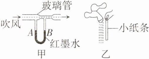 21. 如图甲所示的装置上方是一根粗细不均匀、两头开口的玻璃管,管下连通一个装有红墨水的U形管,当用吹风机向玻璃管中吹风时,发生的现象是B端液面比A端液面______,这是因为在流体中,流速越大的位置,压强越______(选填“大”或“小”)的原理导致的;由此可推断,当图乙中的小纸条靠近水龙头下的稳定水流时,小纸条会______(选填“靠近”或“远离”)水流。