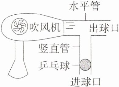 20. 如图为乒乓球爱好小组自制的发球机示意图,当吹风机向水平管吹风时,乒乓球从进球口上升到水平管中,在风的作用下从出球口飞出。这是因为水平管与进球口的乒乓球之间空气 ( )