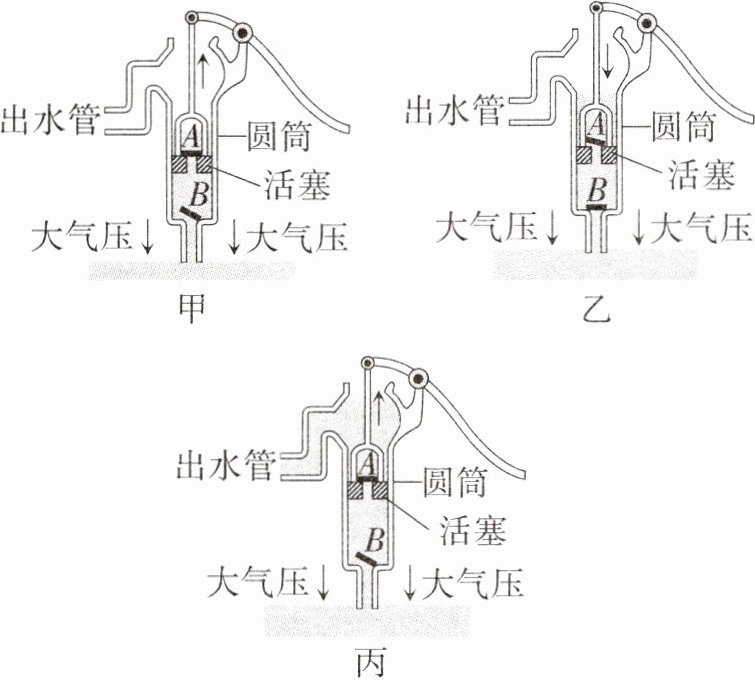 19. 如图是活塞式抽水机工作原理的示意图。其中,活塞跟筒壁紧密接触但是可以上下滑动,A、B是只能向上开启的阀门。若提起活塞,阀门A受到大气压的作用而关闭,活塞的下面空气稀薄,圆筒内气压______外界的大气压。于是,低处的水受到大气压的作用推开阀门B进入圆筒(图甲);当压下活塞时,阀门B被水压下而关闭,水受阻不能向下流动,于是冲开阀门A进入圆筒的上部(图乙);再提起活塞时,活塞上面的水迫使阀门A关闭,水从侧管流出。与此同时,井里的水又在大气压的作用下推开阀门______而进入圆筒(图丙)。这样,活塞不停地上下移动,水就从管口连续不断地流出。有经验的人在使用该抽水机时先往圆筒里倒一点水,目的是增强活塞与筒壁间的__________。