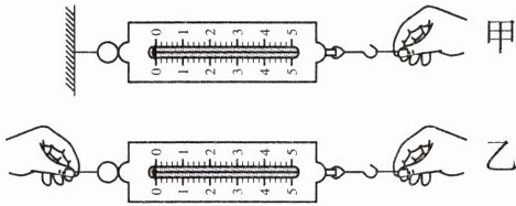 10. 如图甲所示,用4 N的拉力水平向右拉弹簧测力计,此时弹簧测力计的示数为______N;如图乙所示,用4 N的拉力向两边水平拉弹簧测力计,此时弹簧测力计的示数为______N。