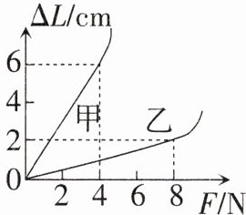 9. 小明想自制一个弹簧测力计,他选择了甲、乙两根不同规格的弹簧进行测试,测得拉力F与弹簧伸长量ΔL的关系如图所示,下列说法正确的是 ( )