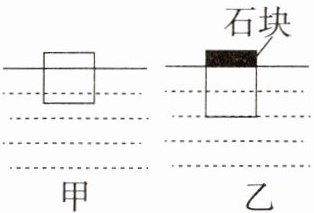 11. 棱长为 0.1 m 的正方体木块,漂浮在水面上时,有$\frac{2}{5}$的体积露出水面,如图甲所示。将木块从水中取出,放入另一种液体中,并在木块表面上放一重 2 N的石块。静止时,木块上表面恰好与液面相平,如图乙所示。g 取 10 N/kg,已知水的密度$\rho_{水}=1.0×10^{3}\text{ kg/m}^{3}$。求: