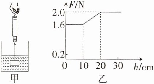 (1)由图乙可知,圆柱体完全露出水面时,弹簧测力计的示数为2 N,由二力平衡知识得,圆柱体的重力$G = 2\ N$。圆柱体的质量$m=\frac{G}{g}=\frac{2\ N}{10\ N/kg}=0.2\ kg$。
