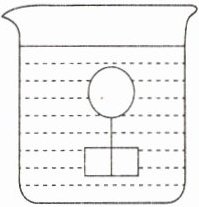 9. 如图所示,气球下面用细线悬挂一石块,它们恰好共同悬浮在水中。已知石块与气球所受的总重力为$G_{总}$,则气球受到的浮力$F_{浮}$____(选填“>”“<”或“=”)$G_{总}$;若水温升高,石块将____(选填“上浮”“下沉”或“保持悬浮”)。