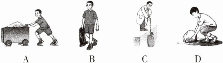 C **解析**:用力推小车没有推动,车在力的方向上没有移动距离,人对小车没有做功,A不符合题意;提着滑板在水平路面上前行,滑板在力的方向上没有移动距离,人对滑板没有做功,B不符合题意;物体在绳子拉力的作用下升高,人给物体一个向上的拉力,物体在拉力的方向上移动了距离,所以力对物体做功,C符合题意;人用力搬石头,但没有搬动,有力作用在石头上,但石头没有移动距离,人对石头没有做功,D不符合题意。