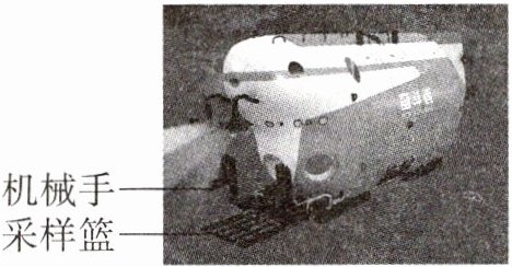 13. 如图所示,我国的“奋斗者”号载人潜水器是目前人类下潜深度最大,也是国际上唯一能同时携带3人多次往返全海深作业的载人深潜装备。2020年11月10日,“奋斗者”号成功坐底马里亚纳海沟,下潜深度达10 909 m,前部的两个机械手从海底抓取了一块质量为8.4 kg、体积为3 dm³的深海岩石,固定在采样篮上带出了水面。求:(海水密度为1.0×10³ kg/m³,$g$取10 N/kg)
