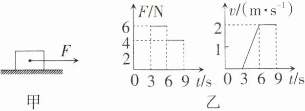 11. 如图甲所示,水平地面上的一物体,受到方向不变的水平推力$F$的作用,推力$F$的大小与时间$t$的关系以及物体运动的速度$v$与时间$t$的关系如图乙所示。第2 s末时,物体处于________状态;在6~9 s内,推力$F$做的功是________ J;第5 s末,物体所受的摩擦力是________ N。