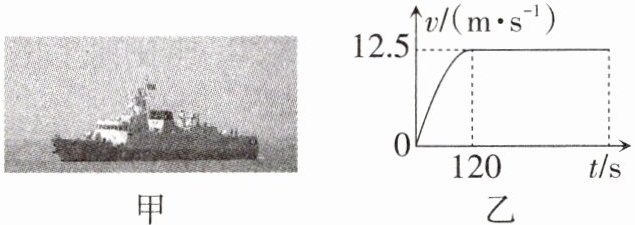10. 如图甲是中国海军十堰舰停泊在港湾时的情景,相关参数如下表。执行任务过程中,该舰以恒定最大推进功率航行。求:(g取10 N/kg)