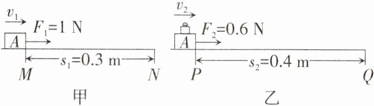 7. 如图甲所示,物块A重5 N,A在水平拉力$F_{1}$的作用下沿水平面从M点匀速直线运动到N点用时3 s;在A上放置一个钩码后,A在水平拉力$F_{2}$的作用下,在另一水平面从P点匀速直线运动到Q点用时2 s,如图乙所示。