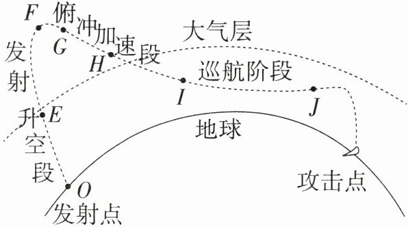 12. 巡航导弹是导弹的一种,具有突防能力强,难以拦截的优点。如图为某巡航导弹的飞行路线图,发射升空段,发动机点火,导弹以极快的速度穿出大气层升至高空;俯冲加速段,发动机处于关闭状态,导弹向下俯冲,会被加速到极高的速度;巡航阶段,主发动机的推力与阻力平衡,弹翼的升力与重力平衡,可以实现远距离“巡航状态”,最后精确打击目标。下列关于该巡航导弹的说法正确的是( )