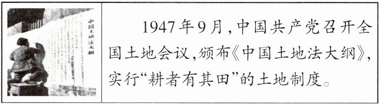 - **解析**:根据图文信息并结合所学知识可知,1947年《中国土地法大纲》的颁布,促进了解放区的土地改革,使农村的阶级关系和土地占有状况发生了根本性变化,激发了农民革命和生产的积极性;1950年《中华人民共和国土地改革法》的颁布,促进了新解放区的土地改革,激发了农民的生产积极性,也大大解放了农村生产力。所以,这些措施的共同作用是调动了农民的生产积极性,推动了农业的发展,D项正确。1945年抗日战争胜利,与材料时间不符,A项排除;到1952年底土地改革完成,彻底摧毁了封建土地制度,B项排除;解放区的土地改革保障了解放战争最终胜利,C项排除。故选D。