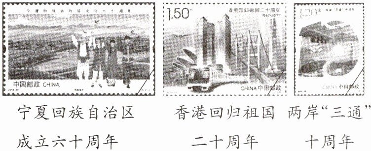 答案:B 命题意图:本题设置真实任务情境,考查民族团结与祖国统一。 解析:根据邮票名称中的关键词“宁夏回族自治区成立”“香港回归祖国”“两岸‘三通’十周年”可知,三张邮票反映的共同主题是民族团结与祖国统一,B项正确。A、C、D三项均不符合题意,排除。故选B。