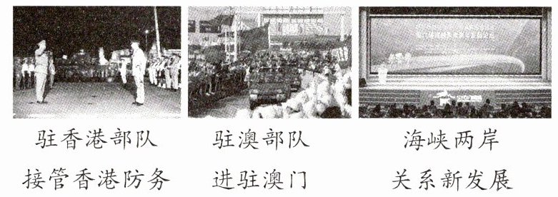 答案:B 命题意图:本题设置真实任务情境,考查香港和澳门回归祖国、海峡两岸关系的发展。 解析:根据图片可知,三幅图片分别对应的是1997年香港回归、1999年澳门回归、新时期海峡两岸关系的发展。结合所学知识可知,港澳回归以及海峡两岸关系的发展,说明祖国统一大业不断推进,B项正确。A、C、D三项与图片无关,排除。故选B。