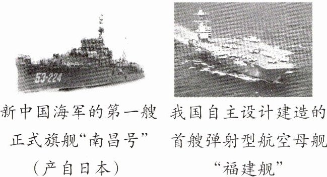 3. 新中国成立初期,海军只有百余艘陈旧舰艇。1971年,我国自行研制的导弹驱逐舰完成了多次科学试验和对外出访任务。2022年6月17日,我国第三艘航空母舰成功下水,并被命名为“福建舰”。材料表明 ( )