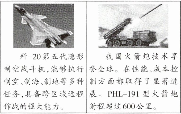 B **命题意图**:本题立足历史解释,考查新中国国防现代化建设。 **解析**:根据材料“歼 - 20第五代隐形制空战斗机,能够执行制空、制海、制地等多种任务,具备跨区域远程作战的强大能力”“我国火箭炮技术享誉全球。在性能、成本控制方面都取得了显著进展”可知,材料反映出新中国军队的武器装备现代化水平不断提高,B项正确。A、C、D三项材料未体现,排除。故选B。