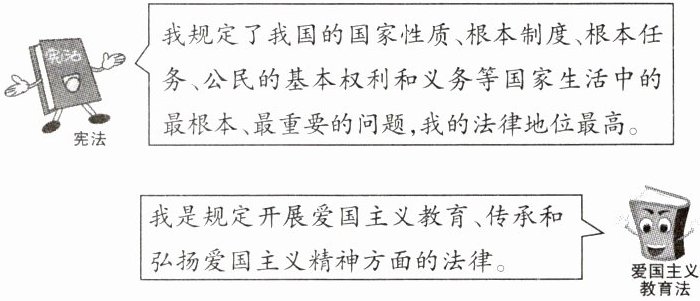 (1)①两部法律规定的内容不同:宪法规定国家生活中带有全局性、根本性的问题,爱国主义教育法规定爱国主义教育方面的问题。②两部法律的法律效力、法律地位不同:宪法具有最高的法律效力,爱国主义教育法是根据宪法制定的。(每点2分,共4分)