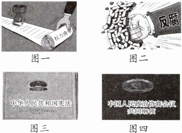 (1)本题考查宪法常识。依据所学知识回答即可。(2)依据所学知识,分析宪法摘录内容可知,宪法的制定和修改必须遵循严格的程序。(3)①图一“权力清单”和图二“反腐”,都有利于国家机关及其工作人员依法行使权力,从而保障公民的权利,反映出我国宪法的核心价值追求是规范国家权力运行以保障公民权利。②依据所学知识可知,1954年9月20日,第一届全国人民代表大会第一次会议通过了我国第一部宪法;1949年9月29日,中国人民政治协商会议第一届全体会议通过了《中国人民政治协商会议共同纲领》。(4)分析宪法条文,“一切法律、行政法规和地方性法规都不得同宪法相抵触”,说明宪法具有最高的法律效力;“一切国家机关和武装力量、各政党和各社会团体、各企业事业组织都必须遵守宪法和法律”,体现了任何公民、社会组织和国家机关都必须以宪法和法律为行为准则;两条规定表明宪法具有至高无上的权威。 @@(1)A:1982年(1分)B:第二章公民的基本权利和义务(1分)C:沿着中国特色社会主义道路,集中力量进行社会主义现代化建设(1分)(2)摘录内容体现了坚持依宪治国必须严格遵循宪法的制定和修改程序。(2分)(3)①规范国家权力运行以保障公民权利。(1分)②图三:1954年;(1分)图四:1949年。(1分)(4)①宪法具有最高的法律效力;②任何公民、社会组织和国家机关都必须以宪法和法律为行为准则;③宪法具有至高无上的权威;等等。(答出两点即可,2分)