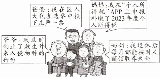 C@@本题考查公民基本义务。爸爸在区人大代表选举中投票是依法行使选举权和被选举权;妈妈申报补缴了2023年度个人所得税,履行了依法纳税的义务;奶奶退休后每月按时足额领取养老金,依法享有物质帮助权;爷爷及时制止放生外来入侵物种的行为,履行了维护国家利益的义务。由以上分析可知,妈妈和爷爷履行了基本义务,爸爸和奶奶行使了基本权利,C项符合题意,A、B、D三项排除。故选C。
