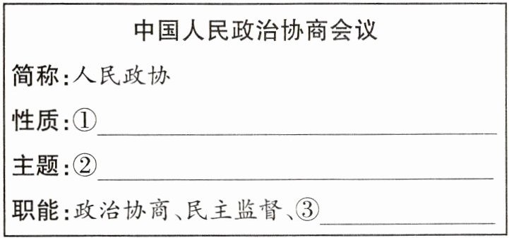 (1)为帮助同学们增进对人民政协的了解,请你将以下知识卡片中的横线处部分补充完整。(3分)