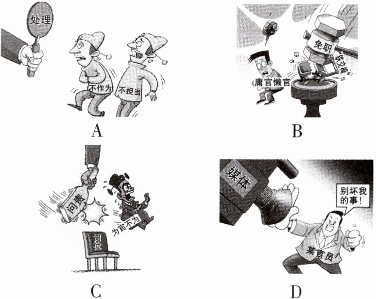 D 解析:本题考查规范权力运行。材料强调要严格行政问责,漫画A中对不作为、不担当的行政机关工作人员进行处理,体现了行政问责;漫画B中对庸官懒官给予免职处分,体现了行政问责;漫画C中对“为官不为”者进行问责,体现了行政问责;漫画D中“某官员”拒绝媒体监督,与行政问责无关。本题为逆向选择题,故选D。