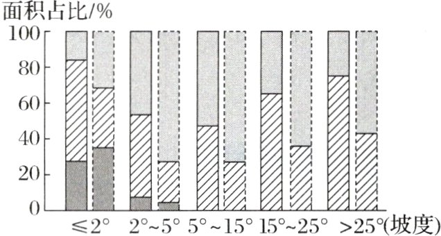 对于山地而言,地形作为影响植被分布的最基本的生境因子,通过外部形态(如坡度、坡向等)影响气温、降雨等气候条件的空间分布,并在一定程度上影响人类活动,从而影响植被的空间分布格局。下图为秦岭不同植被变化类型在不同坡度、坡向的面积占比示意图。据此回答6~8题。