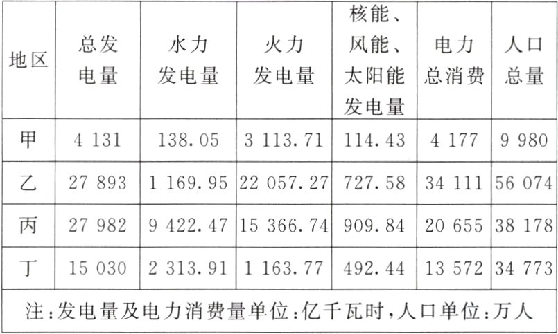 下表为2019年我国四大地区总发电量及水力发电量,火力发电量,核能、风能及太阳能发电量,电力消费总量和地区人口总量统计表。据此完成6~8题。