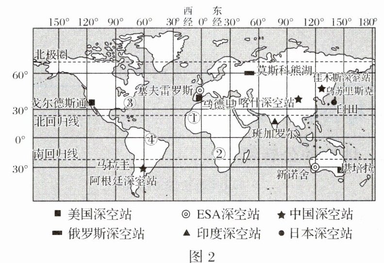 (3)为进一步优化我国深空站的全球布局,图2中①—④可选为站址的是( )