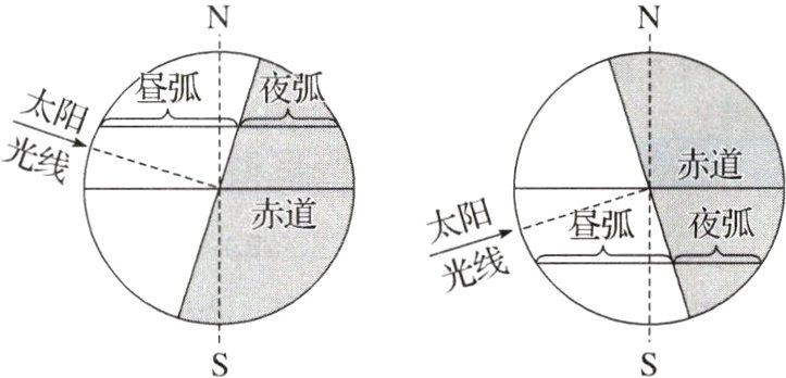 |冬半年(自秋分日至次年春分日)|昼短夜长|纬度越高,昼 ,北极附近出现 现象|