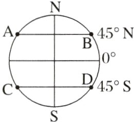 (2)相对于赤道或地心对称的点(A与C、B与D、A与D、B与C):南北半球昼夜相反(北半球点的昼长等于南半球点的夜长)。