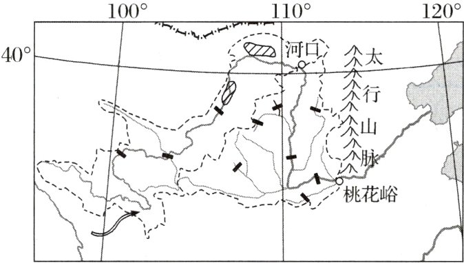 (2)太行山西侧受西北风影响,黄河中上游蒸发的水汽受太行山地形抬升的作用,属于迎风坡的位置,降水较多;而黄土高原受边缘海拔阻挡的影响,导致内部降水少,且距海较远,气候更加干旱,降水量较少。