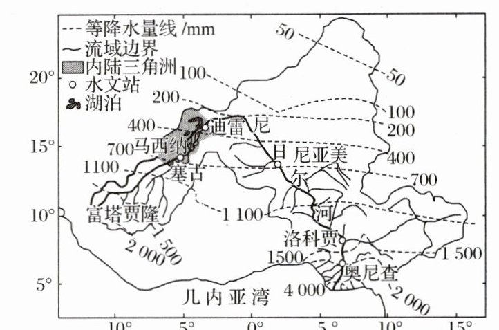 材料一 尼日尔河源于富塔贾隆高原,注入几内亚湾,全长约4200 km,流域面积210万km²,在塞古—迪雷间的盆地形成大型内陆三角洲,在几内亚湾发育了巨型河口三角洲。