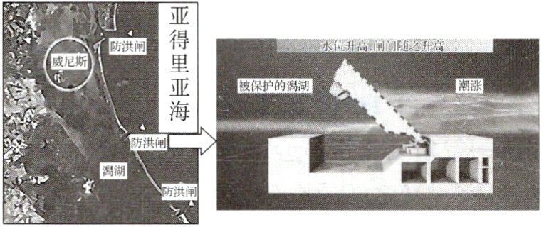(水上城市)威尼斯是世界著名的水上城市,它的未来与潟湖密切相关。为了抑制潟湖潮汛的影响,政府计划修建可开合的风暴潮屏障计划。这些屏障架设在岛屿之间入海口的海床上,每当潮水位超过110厘米时,中控防洪闸就会充气上浮并封闭。由于该项目极具争议,如今能否完工仍遭到质疑。读图,完成3~4题。