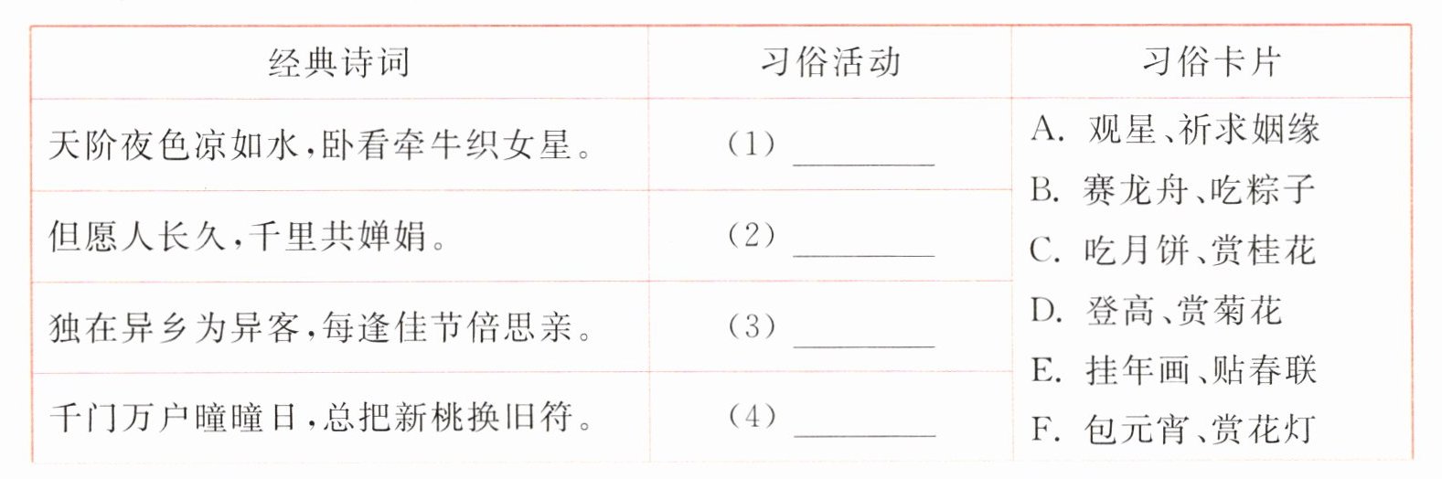 2.(2024·江苏盐城期中选编)小文发现很多诗词都描绘了传统节日的习俗活动,准备在班级展示,但他不确定下列诗词所对应的习俗活动,请你帮小文做出正确选择。(填序号)