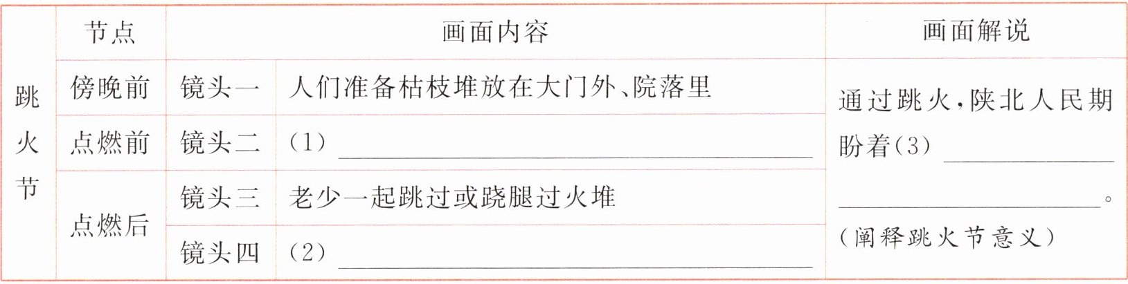 (1) 结合第②段“跳火节这天的吃食是有讲究的”可知,白日里准备吃食是跳火节的一部分,可以丰富观众对跳火节的了解。人们对吃食的讲究,体现了他们对跳火节的重视,为跳火仪式营造了节日氛围。结合第③段“那个味美,直能把肠子香遍、头发梢梢香软;那快颐的咬嚼之声,仿佛雨点子打在干燥的黄土上,往心里洇开一层层的甘霖”可知,白日里准备吃食表现了人们对美好生活的向往和追求,与跳火节仪式的意义紧密相连。