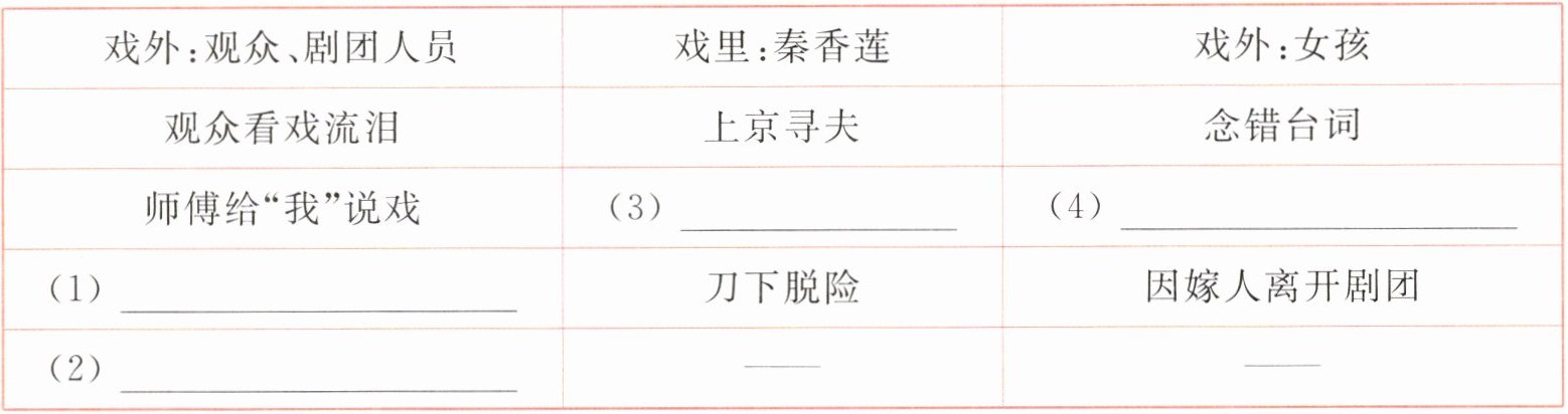 8. **新考法 情节梳理**:文章主要围绕《秦香莲》一戏展开叙述,请你梳理戏里戏外的有关事件。