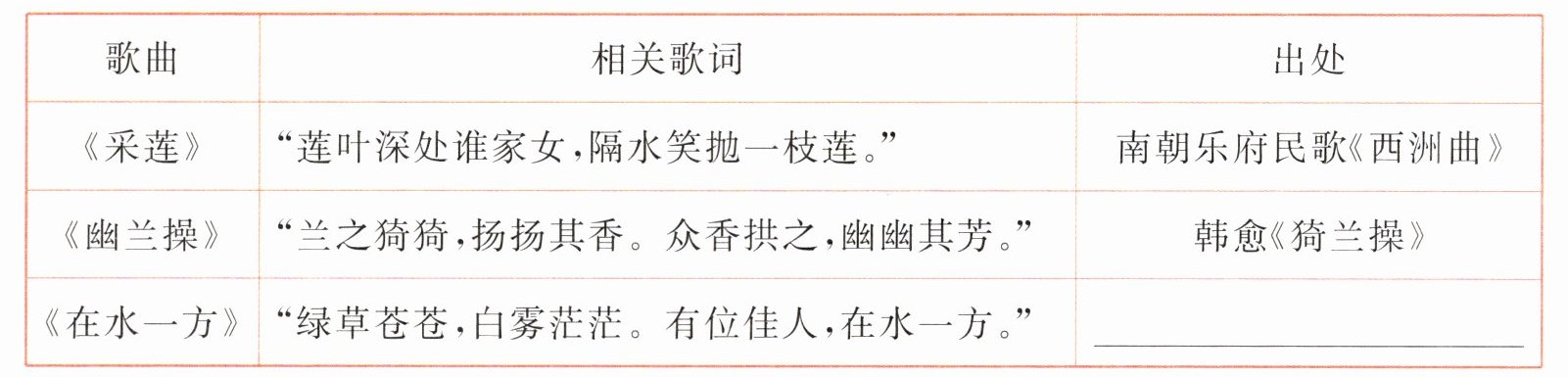 - (2)小语向大家推荐了三首由古诗改编的歌曲。请你仿照示例,根据歌曲名称及歌词内容,写出《在水一方》的出处。
