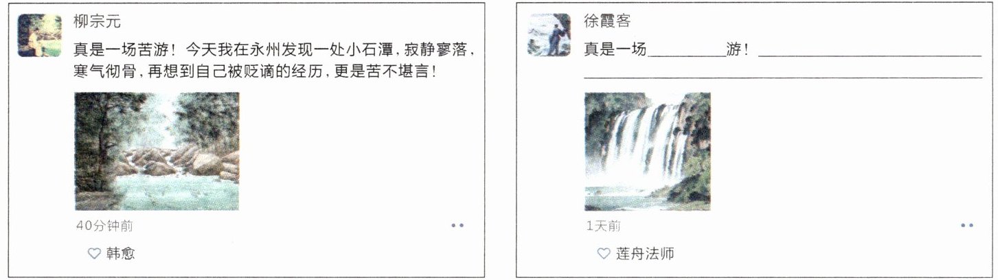 8. 假如徐霞客有朋友圈,你会看到什么内容呢?请参照示例,在空缺处填入一个合适的字,再结合乙文,大胆想象,帮他把朋友圈补充完整。