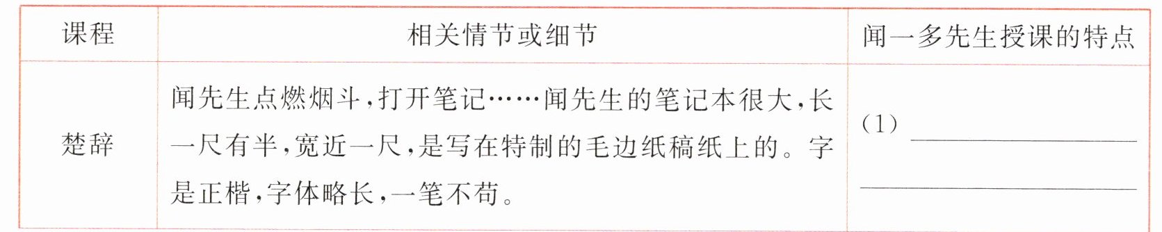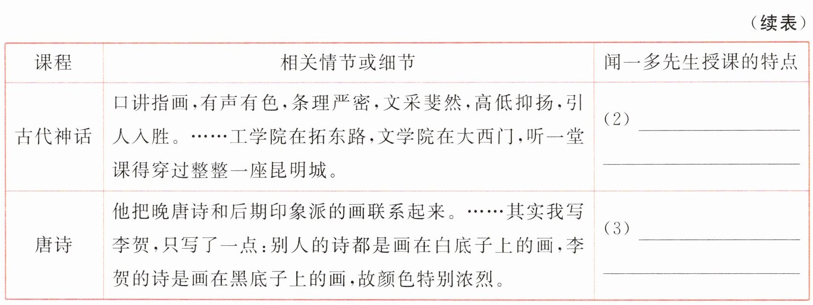 9. 本文重点写闻一多先生上楚辞、古代神话和唐诗三门课的情形,结合文章内容,完成表格。