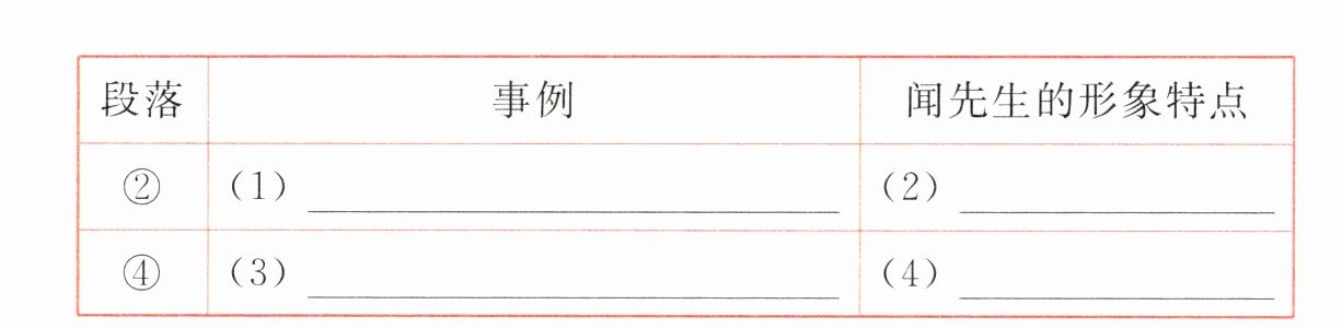 8.(新考法 情节梳理)第②段和第④段用了两个事例来体现闻一多先生的形象特点,请简要概括。