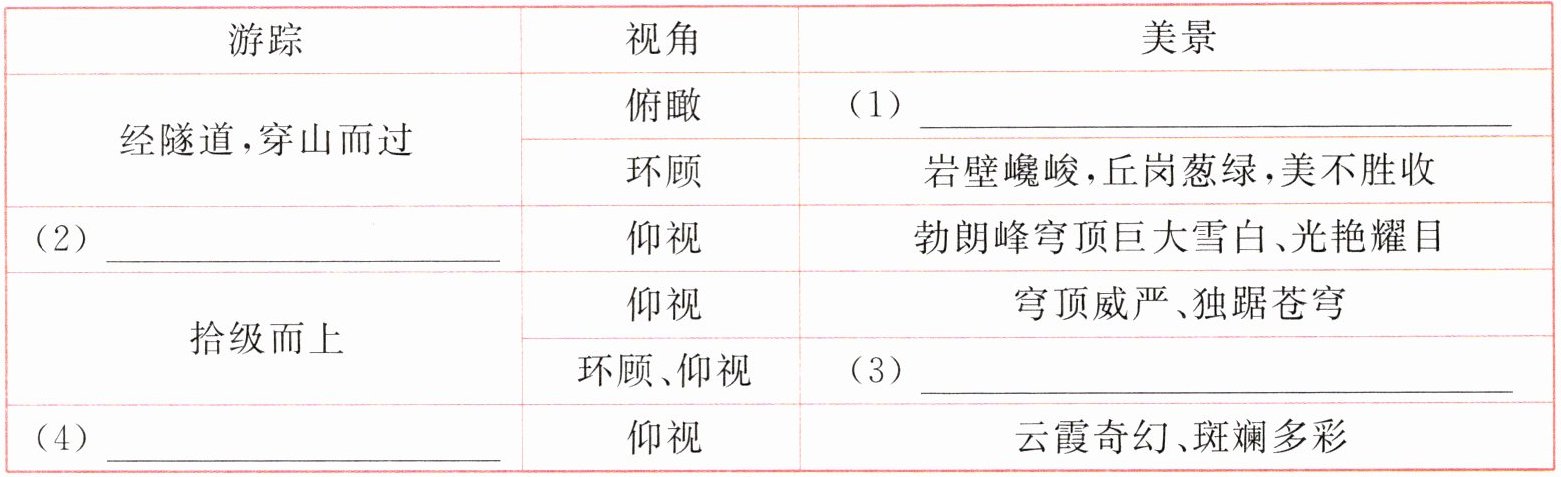 5. 新考法 脉络梳理 课文第2~6段中作者的游踪有怎样的变化?在这个过程中,他看到了哪些美景?请简要概括,完成下表。