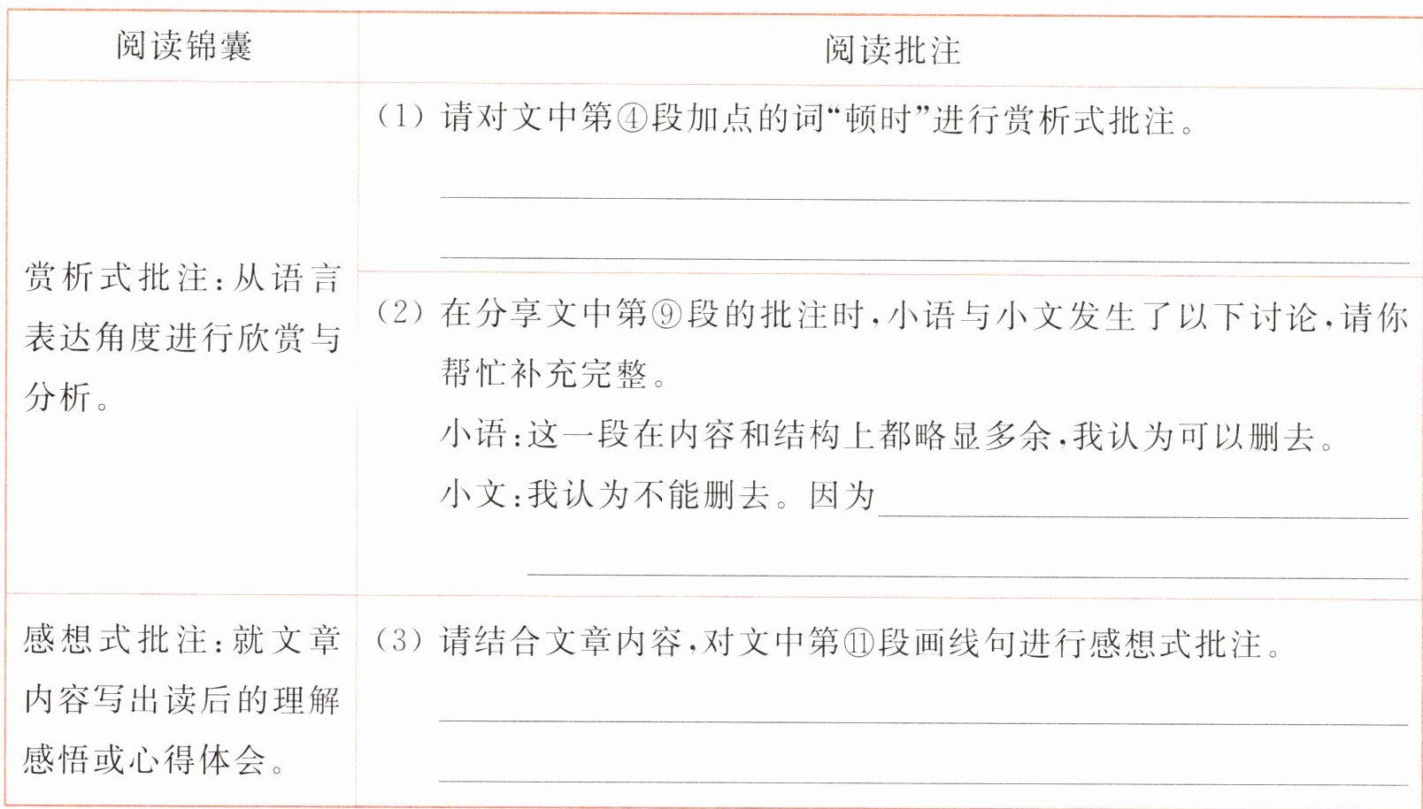 12. **新趋势 批注添加** 做批注是非常好的读书方法,请根据下面表格中的“阅读锦囊”完成阅读批注。