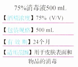 解析:由图可知,该瓶75%的酒精消毒液的体积为500 mL = 500 cm³,则其中酒精和水的体积分别为V酒精 = V×75% = 500 cm³×75% = 375 cm³ = 375 mL,V水 = V - V酒精 = 500 cm³ - 375 cm³ = 125 cm³,由ρ = $\frac{m}{V}$可得,酒精和水的质量分别为m酒精 = ρ酒精V酒精 = 0.8 g/cm³×375 cm³ = 300 g,m水 = ρ水V水 = 1.0 g/cm³×125 cm³ = 125 g,则500 mL 75%酒精消毒液的总质量m = m酒精 + m水 = 300 g + 125 g = 425 g,75%的酒精消毒液的密度ρ = $\frac{m}{V}$ = $\frac{425 g}{500 cm³}$ = 0.85 g/cm³。
