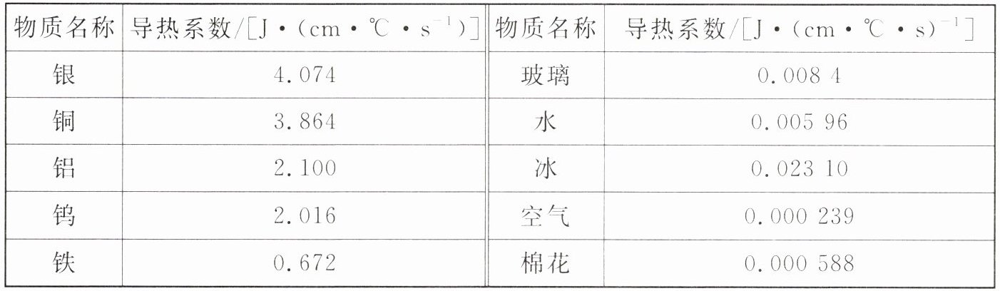 (2)不同物质传导热的能力可用导热系数λ来表示. 导热系数是热的传导作用在1 cm²截面上温差为1 ℃时1 s内通过1 cm长度的热量. 下表是一些物质的导热系数.
