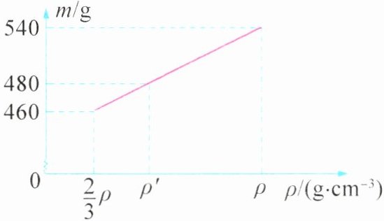 A 解析:设烧杯的质量为$m_{杯}$、烧杯的容积为$V$、液体的密度为$\rho_{液}$,烧杯和液体的总质量$m_{总}=m_{杯}+m_{液}=m_{杯}+\rho_{液}V_{液}$. 由图可知,当烧杯和液体的总质量为$460\ g$时,液体的密度为$\frac{2}{3}\rho$,即$460\ g = m_{杯}+\frac{2}{3}\rho V$ ①;当烧杯和液体的总质量为$540\ g$时,液体的密度为$\rho$,即$540\ g = m_{杯}+\rho V$ ②. 联立①②,可得$\rho V = 240\ g$、$m_{杯}=300\ g$,由$m = \rho V$可知,体积一定时,质量与密度成正比,所以当烧杯和液体的总质量为$480\ g$时有$\frac{480\ g - 300\ g}{460\ g - 300\ g}=\frac{\rho'}{\frac{2}{3}\rho}$,解得$\rho'=\frac{3}{4}\rho$,故 A 正确.