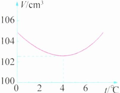 8.(2024·湖北襄阳模拟)如图所示是一定质量水的体积随温度变化的图像,观察这个图像,可以得出:水在______$^{\circ}C$时的体积最小;从$0^{\circ}C$到$6^{\circ}C$的过程中,水的密度变化情况是__________(选填“变大”“变小”“先变大后变小”或“先变小后变大”,下同);当这些水全部结成冰之后,体积会________.