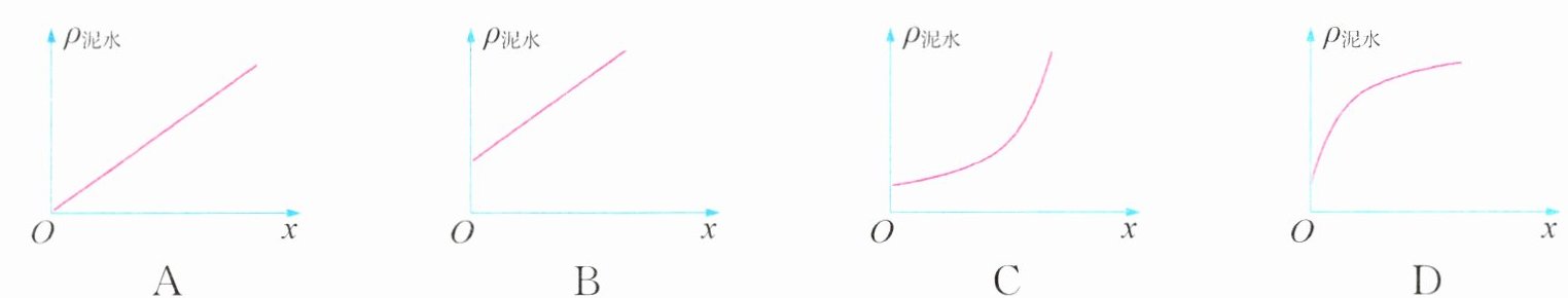 B 解析:由含沙量的定义可知,体积为$V$的泥沙水中,沙的质量$m_{沙}=xV$,沙的体积$V_{沙}=\frac{m_{沙}}{\rho_{沙}}=\frac{xV}{\rho_{沙}}$,水的体积$V_{水}=V - V_{沙}=V-\frac{xV}{\rho_{沙}}$,水的质量$m_{水}=\rho_{水}V_{水}=\rho_{水}V(1 - \frac{x}{\rho_{沙}})$,水与沙的总质量$m_{泥水}=m_{水}+m_{沙}=\rho_{水}V(1 - \frac{x}{\rho_{沙}})+xV$,泥沙水的密度$\rho_{泥水}=\frac{m_{泥水}}{V}=\rho_{水}(1 - \frac{x}{\rho_{沙}})+x=\rho_{水}+(1 - \frac{\rho_{水}}{\rho_{沙}})x$,$\rho_{水}$和$\rho_{沙}$为定值,则$\rho_{泥水}$与$x$成正比,且$x = 0$时,$\rho_{泥水}=\rho_{水}$,不为$0$,故 B 正确.
