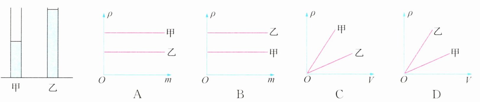 5.(2024·江苏常州期末)如图所示,两个完全相同的圆柱形玻璃容器中分别装有质量相等的甲、乙两种液体,两种液体的密度分别是$\rho_{甲}$和$\rho_{乙}$,则下列关于两种液体密度的图像正确的是 ( )