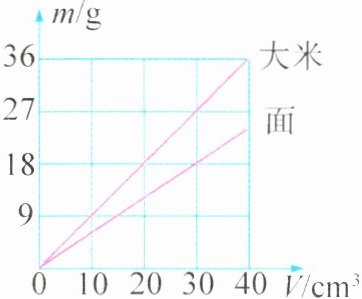 C 解析:由图可知,面的密度$\rho_{面}=\frac{m_{面}}{V_{面}}=\frac{18\ g}{30\ cm^{3}} = 0.6\ g/cm^{3}$,大米的密度$\rho_{大米}=\frac{m_{大米}}{V_{大米}}=\frac{27\ g}{30\ cm^{3}} = 0.9\ g/cm^{3}$,则面、大米的密度之比$\rho_{面}:\rho_{大米}=0.6\ g/cm^{3}:0.9\ g/cm^{3}=2:3$,故A、B错误;由密度公式可得,质量相同时,面、大米的体积之比$V_{面}:V_{大米}=\rho_{大米}:\rho_{面}=3:2$,故C正确;密度是物质的一种属性,与质量和体积无关,随着体积的增加,大米的密度不变,故D错误。